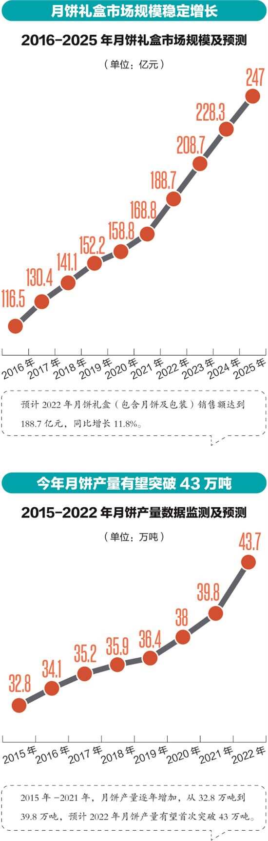 三天的中秋小长假已逐渐接近尾声。作为月饼消费的高峰期,今年的消费者对于月饼的包装、口味、价位等方面的追求愈趋多元化。艾媒咨询发布的《2022年中国中秋月饼礼盒消费者需求研究报告》(下称“报告”)显示,2016-2021年中国月饼礼盒市场规模呈上升趋势,2022年中国月饼礼盒销售额预计可达到188.7亿元,同比增长11.8%。随着消费者饮食升级,对月饼的口味需求多元化,以及节日送礼需求激增,2025年月饼礼盒市场规模有望达247.0亿元。