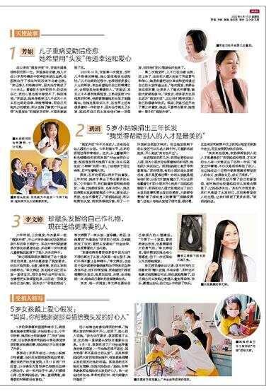 第二次捐发时,儿子已经治愈出院,还上学了,生活的大落大起给了芳姐勇气和信心,她更希望把这份幸运和坚持通过自己的头发传递出去。“每次捐发,我都会发在朋友圈,让更多人了解这件事情,鼓励大家都能参与。”芳姐说,很多朋友也因此成为“捐发天使”,这让他们感受到助人助己的温暖与快乐。现在,芳姐已经开始了第三次蓄发,她说,只要符合要求,她想做一辈子的“捐发天使”。