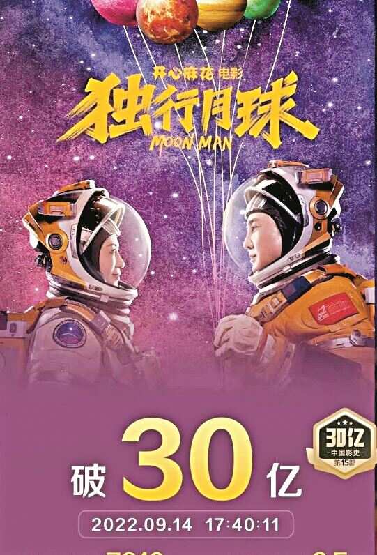 新快报讯 据灯塔专业版实时数据,截至9月14日17时40分,电影《独行月球》票房突破30亿,成为中国影史第15部票房破30亿影片。