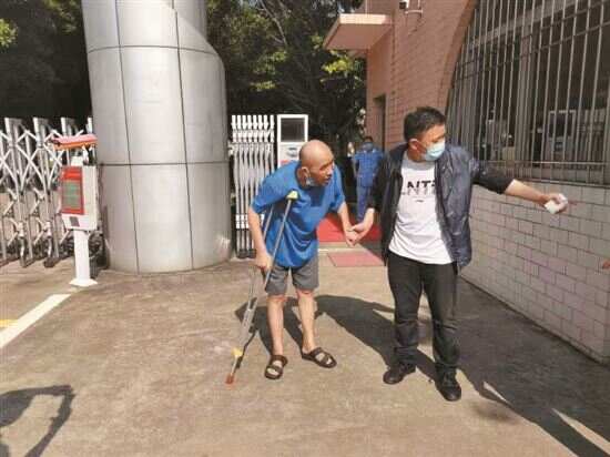 8月28日,马伯弟弟一路奔波来到市救助站,迫不及待接哥哥回家。工作人员为马伯办理好离站手续后,护送马伯到大门岗与弟弟见面。