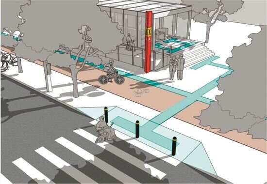 ■地铁站出入口处和站前广场如高差较大设有台阶时,应结合景观环境设置采取坡化措施或设置轮椅坡道等。示意图