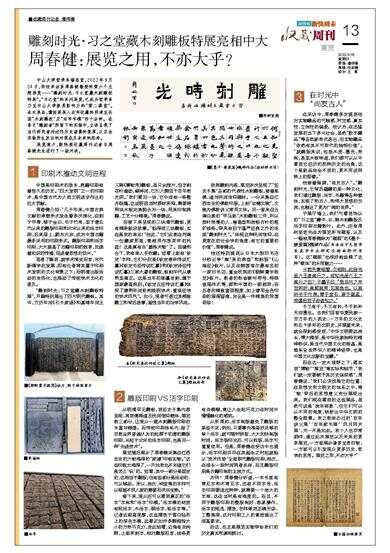在采访中,周春健多次提到他对实物藏品的可触感、时空感、真实性、立体性的偏爱。他认为,在迅猛发展的当下多元社会,虽然“数字藏品”等各类新形式迭出,但实物藏品“依然有其不可取代的独特价值”。“就雕版来说,包括木质、墨色、形制,甚至木板味道,我们都可以从中看到它经历的那种历史的沧桑,这个是纸品体会不到的,更不用说网络上的图像。”
