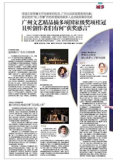 近年来,广州市推进文化强市建设,勇攀文艺精品新高峰,取得诸多好成绩。近日,第十三届中国艺术节公布的多个奖项中,广州喜获多项殊荣,一举摘下“文华奖”“群星奖”和“牡丹奖”。新快报记者在采访中得知,他们当中,有人连续五届荣膺文华导演奖,因为广东出品摘获奖项而倍感自豪;有人首创绝技“肩上芭蕾”,让优雅芭蕾与惊奇杂技完美融合……让我们一起听听他们获奖背后的故事。