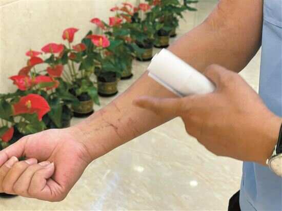 ▲严少涛手上还留有救援时被杂草割伤的痕迹。新快报记者 李应华/摄