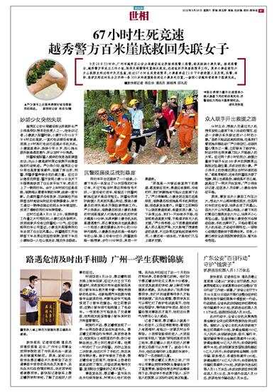 9月18日23时许,广州市越秀区公安分局建设派出所接到报警人报警,称其妹妹小康失联。接到报警后,越秀警方即成立工作小组,按照失联警情处置相关规定,迅速组织开展查找搜寻工作。原来小康在前往六片山找朋友的过程中失足坠崖,经过67小时生死竞速搜寻,小康最终在21日下午被救援人员发现,民警、消防、医护及附近村民合力开辟一条300米的救援路径到达小康身处位置,一场惊心动魄的营救终于圆满完成。