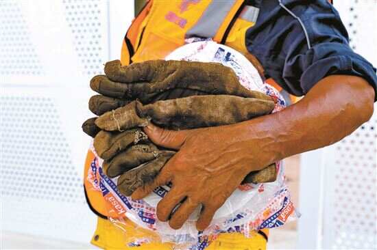 ■磨破的旧手套见证了他们的辛苦。