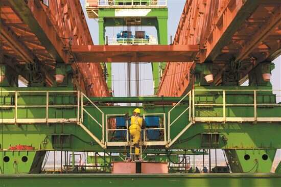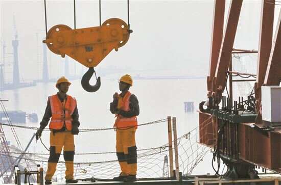 ■大桥建设者冒着高温施工。