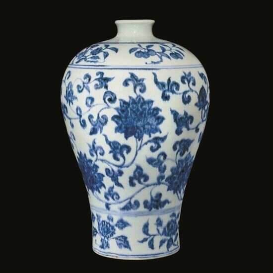 拍卖方介绍,莲纹梅瓶自景德镇产青花瓷以来便有烧造,然其中经典非永乐(1403-1424年)莫属,见证御窑登峰造极。因宫廷督造,永乐梅瓶集前朝之大成,无论器形、纹饰,皆一丝不苟,观之赏心悦目,陈之平稳妥当。此梅瓶之缠枝莲尖叶弯卷,乃佛教莲华,为佛菩萨法座,因出淤泥而不染,象征无垢清净,其佛教寓意尤胜眼中景致。梅瓶笔触所及多见钴蓝细点,称“铁锈斑”,乃早期青花画片特色,被后世奉为上乘青花独有之美。
