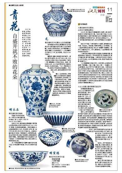 他在文中写道:“元青花装饰十分富丽,装饰题材也很丰富,飞鸟鱼虫、人物走兽、风景花草等让人目不暇接。有一些纹样很典型,像当地人称之为‘板凳脚’的莲瓣纹、‘葫芦叶’的缠枝牡丹叶。另外,像海浪纹、八宝纹等都是元青花的标志性纹样。”
