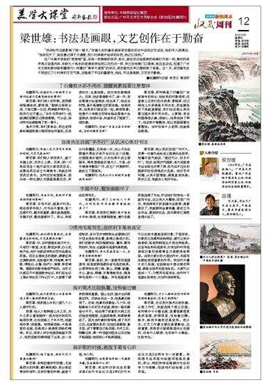 在广州美术学院的“教授楼”里,总有一把爽朗的笑声,那天,就在采访组搭乘的电梯打开那一刻,熟识的笑声再次迎面而来,年龄九十有余的容璞老师如同以往约访一样,早已在电梯门口等候,她边走边说,知道了广州市文联和新快报收藏周刊一同邀约“美学大课堂”的采访,梁世雄先生早已提前做了准备。这一天,梁世雄先生不但回忆了小时候的文艺气氛,还强调了书法的重要性,他说,书法是画眼,文艺在于勤奋。