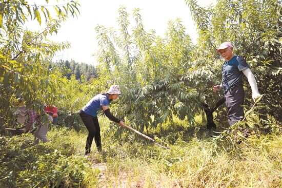 ■旧城鹰嘴桃基地负责人邵润坚(右)带着村民在基地剪枝、除草,村民在大家共同的产业务工,特别卖力。