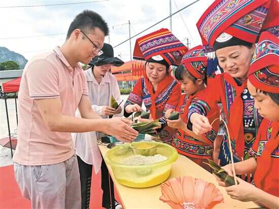 ■在庆六一、迎端午活动中,张龙健与忻城异地搬迁安置点老师、孩子一起包粽子。