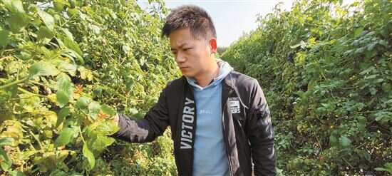 ■邹海军到田间查看当地产业圣女果的长势和出果情况。