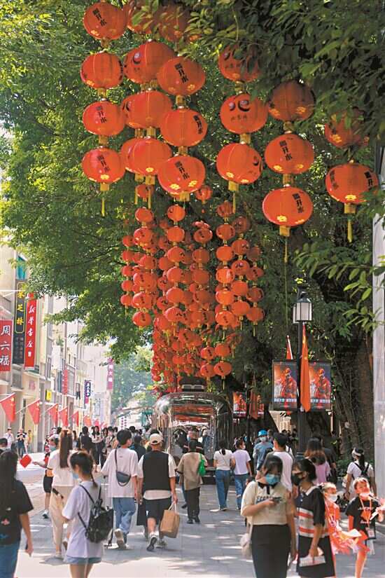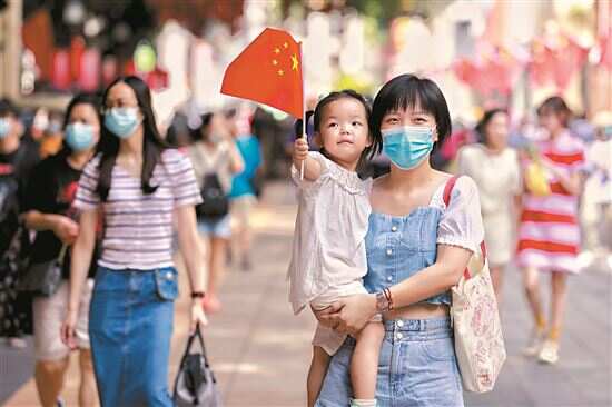 10月1日国庆节,广州市北京路上张灯结彩,一面面五星红旗迎风飘扬,市民们挥舞着小国旗,节日氛围浓厚。