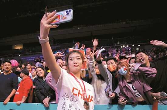 ■中国队球员李梦赛后与球迷合影。新华社发