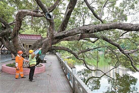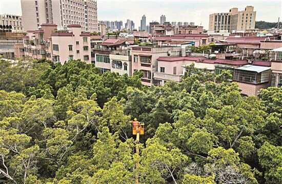 ■槎龙村先后建成了4个公园,为居住环境增添绿化,图为绿化工人正在养护彭加木公园的古榕树。