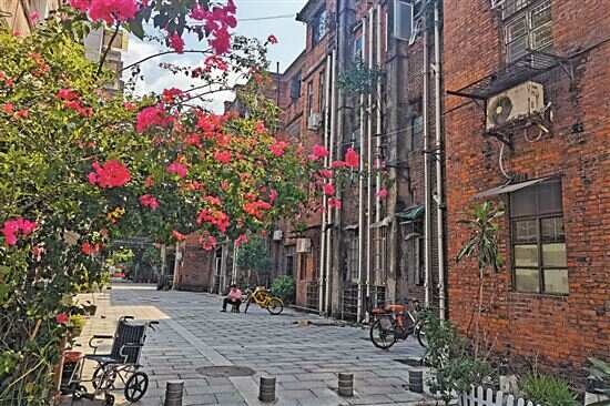 从荔湾区南岸路北转入电业社区,外面是车水马龙,社区内则静谧秀美。邻里花园几步一景,树木郁郁葱葱,具有年代历史感的红砖墙楼房前,勒杜鹃盛放,时光仿佛在这里停止。