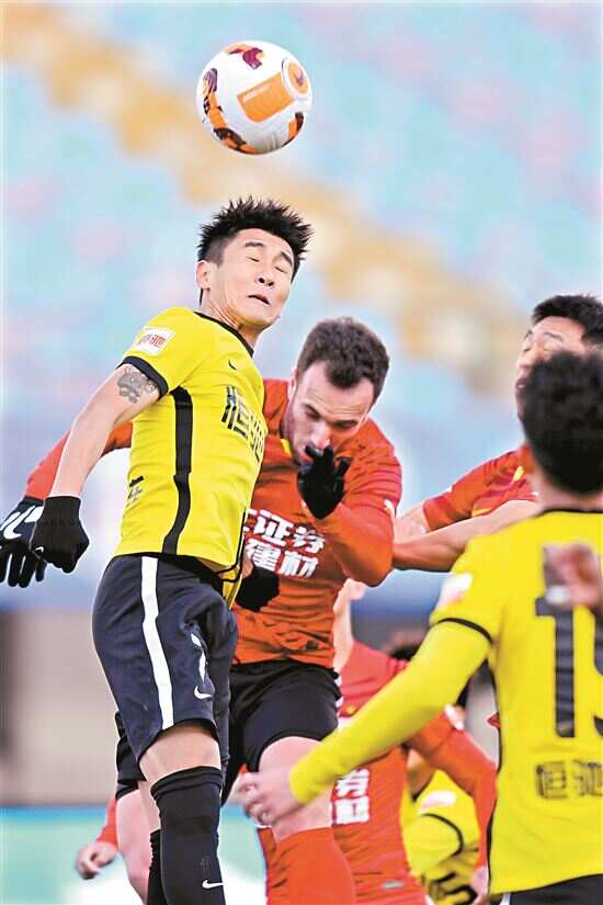 ■广州队球员韦世豪(左一)在比赛中争顶。 新华社发