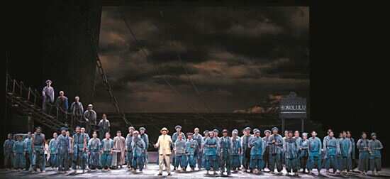 舞台上,檀香山码头一组组华工的劳作画面,望乡曲唱出了侨胞对家乡、亲人的无限眷念;香山县平静广阔的海面传来高胡、三弦、笛箫、琵琶奏出的歌谣,广东特有的音调唤醒对“乡音”的思念与情愫;侨批局里算盘声劈里啪啦,唐有信刚劲的独唱,唱出有信有义的同胞之爱;沿海渔村泥坯房里,开满木棉花的林间小道上,五彩斑斓的茫茫海上梦境中,梁董氏与丈夫、婆婆、女儿的深情重唱,唱尽梁家人的悲欢离合,展现了中国人面对苦难不屈的生命力与顽强的抗争精神。