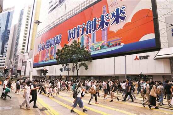 铜锣湾的巨幅大屏上打出“同心庆回归 同行创未来”的字样。