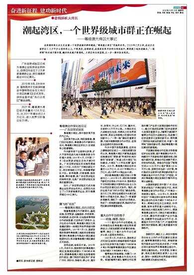 作为中国开放程度最高、经济活力最强劲的区域之一,《规划纲要》发布以来,粤港澳大湾区不断推进基础设施建设的“硬联通”和规则机制对接的“软联通”,“轨道上的大湾区”加快建设,大湾区“1小时生活圈”基本形成。2021年,粤港澳大湾区经济总量约12.6万亿元,比2017年增长约2.4万亿元,进入世界500强企业25家。