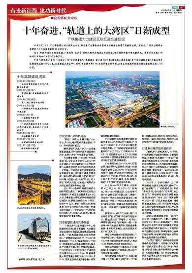 这10年,一条条铁路线的建成令铁路网更加通达,广铁集团的客运能力大幅提升,年旅客发送量最高达5.3亿人次。《粤港澳大湾区城际铁路建设规划》显示,近期规划建设的18个项目,投资4741亿元,形成“轴带支撑、极轴放射”的多层次铁路网络,构建 “轨道上的大湾区”,一步步实现广州、深圳枢纽“四面八方、四通八达、面向全国、连接东南亚”的重要目标。