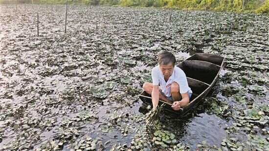 连片的菱叶织成绿色的地毯,将池塘盖得密密实实,采菱人坐在三格采菱船上,从菱叶底部揪出一个个黑色的“小元宝”,不多时,采菱船中间便垒起一座小小的“元宝山”……