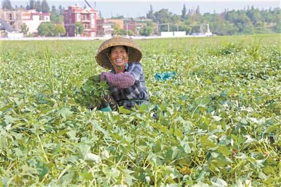 ■村民在番薯叶种植基地工作。