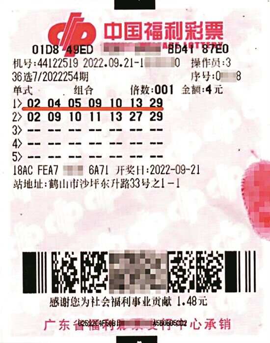 中奖当天,贺先生先是购买了双色球、好彩3、快乐8,细心的销售员发现贺先生没有打当天第22254期36选7的守号票,遂热心提醒。之后贺先生花了4元打了那2组守号。