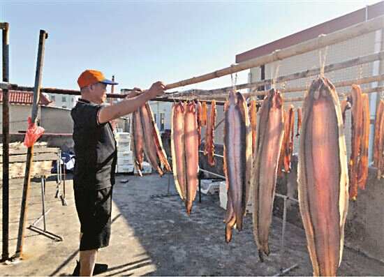 为了抢抓晾晒好时节,他还组织了附近的村民一起制作,新鲜对虾经过冷却后,在村民们手中快速剥壳去内脏。肥美的白鳝鱼被钉在木板上,经过开膛、划花刀、清洗等步骤,即可进行晾晒。