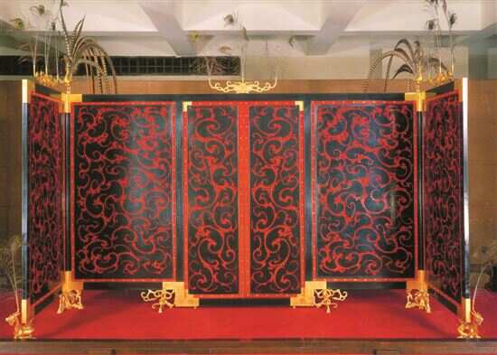 这套屏风结构精巧、装饰华丽。中有屏门,可向后开启,两侧翼障可折叠。屏风为彩绘髹漆,且装饰有大量鎏金泡钉。
