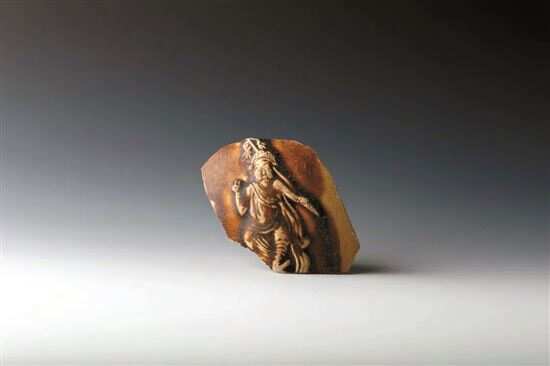 ■唐长沙窑青釉褐斑贴人物纹瓷片。南越国宫署遗址出土。陶片上的人物具有浓厚的异域特色,是典型的胡人舞蹈题材造型,体现了长沙窑产品远销海外,深受外国文化的影响。