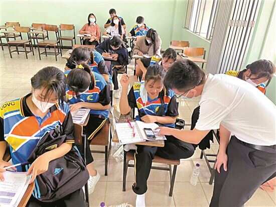 上周末,刚刚为国内大学生分享完2023年国际中文教育志愿者项目的小东给记者分享了一段视频。视频中,他所在泰国学校的高一学生们用中文跟他说:“非常感谢老师,我们很开心!”身穿白色衬衫、戴着口罩的他腼腆回道:“谢谢大家,我也很高兴成为你们的老师!”