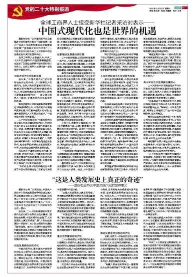 二十大报告指出,中国式现代化是人口规模巨大的现代化;是全体人民共同富裕的现代化;是物质文明和精神文明相协调的现代化;是人与自然和谐共生的现代化;是走和平发展道路的现代化。海外人士认为,中国式现代化拥有丰富内涵和强大吸引力,将积极推动世界繁荣、文明互鉴,为世界注入更多正能量。