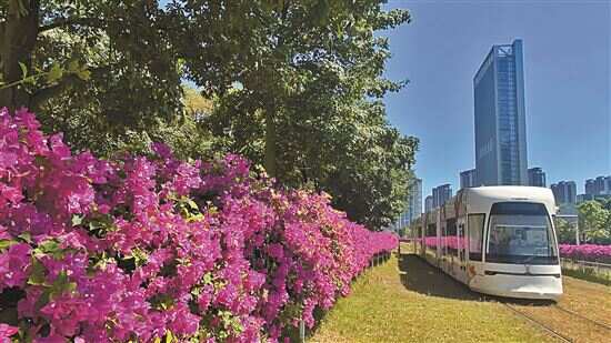 ■阅江中路,色彩浓烈的簕杜鹃为有轨电车的风景“添彩”。