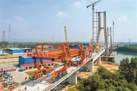 25日,广汕铁路铺架施工最后一孔900吨箱梁成功架设在广州增江特大桥桥墩上,标志着全线箱梁架设完成,全线转入保开通攻坚阶段。设计时速350公里的广汕铁路全长206.2公里,途经广州、惠州、深汕合作区、汕尾,全线预计2023年建成通车。新华社发