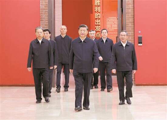■10月27日,中共中央总书记、国家主席、中央军委主席习近平带领中共中央政治局常委李强、赵乐际、王沪宁、蔡奇、丁薛祥、李希,瞻仰延安革命纪念地。这是习近平等在延安革命纪念馆,参观《伟大历程——中共中央在延安十三年历史陈列》。新华社发