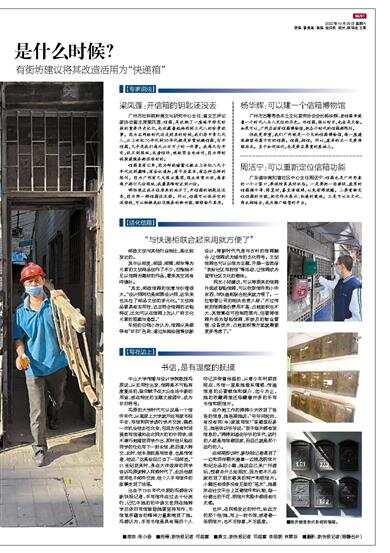 广东省华南和谐社区中心主任周活宁:信箱也是广州形象的一个小窗口,要保持其美好状态。一是要把一些破烂、废用的信箱搞干净、修复好,甚至清理掉,以免有碍观瞻。二要重新定位信箱的功能,把它作为展示、私递的载体。三是可以与文化、商业相结合,成为推广销售的平台。