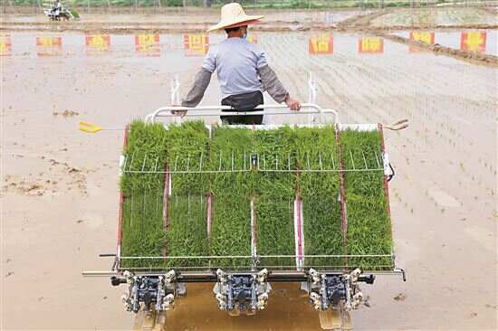 ■在清远市清城区飞来峡镇螺塘村,水稻机械化插秧作业现场。