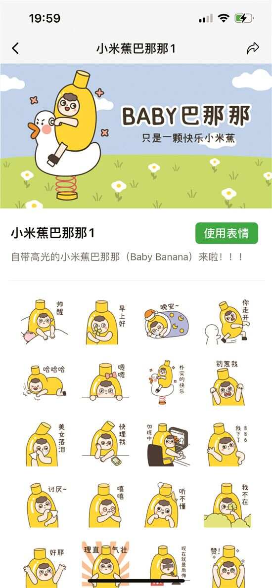 也有部分网友从一张白纸开始绘图设计,设计师黑炭小熊就是其中一位。“制作属于自己的表情包时,画卡通形象可以随心所欲,不需要考虑商用也没有要求很多的甲方爸爸,所以非常高效并且乐在其中。”她分享了自己制作的一套“小米蕉巴那那”表情包,详情页中如是介绍——“BABY巴那那只是一颗快乐小米蕉”。
