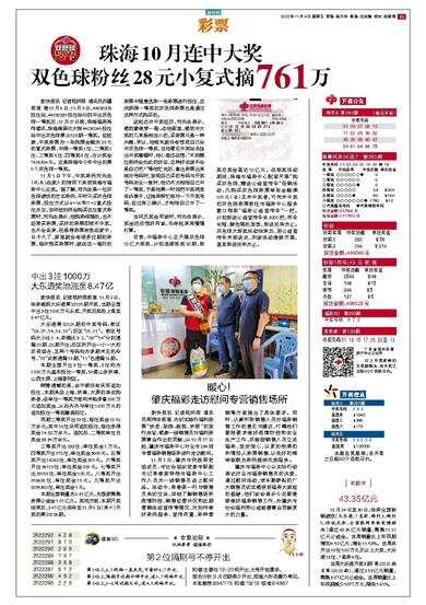 新快报讯 记者陆妍思 通讯员苏疆报道 继10月6日、10月9日,44030325投注站、44030835投注站分别中出双色球一等奖后,10月27日晚,珠海福彩再传喜讯,珠海南屏北大街44030245投注站中出双色球第22123期一等奖。经检索,中奖彩票为一张购票金额为28元的复式彩票,中得一等奖1注、二等奖1注、三等奖6注、四等奖6注,合计奖金7616984元。这是珠海市今年中出的第5个双色球一等奖。
