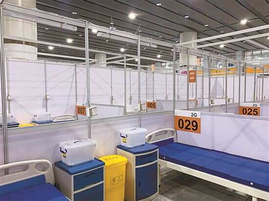方舱医院位于展馆一楼,分为5个大区,共设计了约3450个床位。在其中一个大区内,新快报记者看到约700张床位。按照护理组团说明,该区又分成了7个护理组团,每个组团约100张床,都设有相应固定的配套医护站。医护站沿柱边设置,靠近新风口附近,利于通风换气。