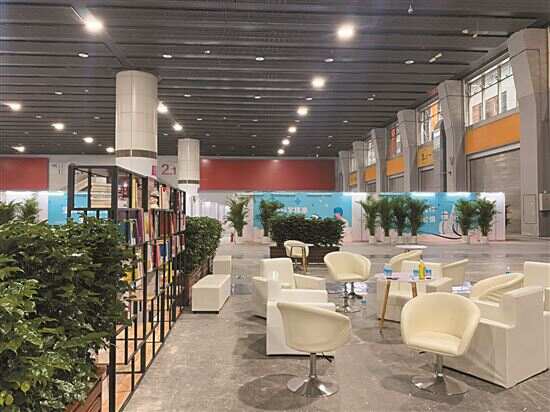 除了通往屋外的一面,空间内其他三面皆封闭。中心区域设有图书角,在文化类图书和休闲类图书两侧放置着一些绿植。坐在白色的沙发上,可以翻翻李清照的词、朱自清的散文,也可以去读《山海经》和《老人与海》。书架另一侧,还放了两台电视机。对面隔板上张贴了醒目的标语:“携手合作,聚力战胜疫情。”