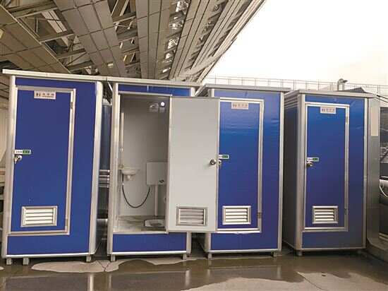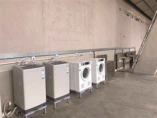 屋内最边上,有单人更衣区,一个个的小隔间里放置着塑料凳子。除了展馆原本的固定厕所外,在屋外,新增了临时饮水、洗澡、洗衣、如厕的设备。饮水机已经能接温水喝了;几台崭新的洗衣机也已备好。根据示意图显示,还会配备5个吹风机。不过,若真要去方舱医院,建议带上吹风机和洗衣粉(液)。