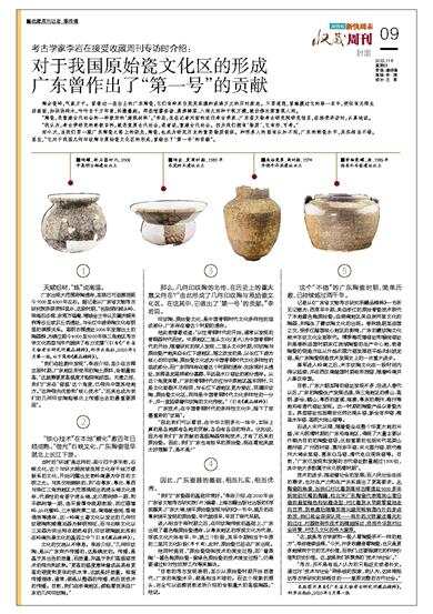 记者从《广东省文物考古研究所藏品精粹》一书所见记载为:西周早中期,来自浙江的原始青瓷技术取代了本地酱色釉原始瓷;自湖南地区来自炭河里文化的陶器,则催生了夔纹陶文化的出现。春秋晚期至战国之交,受浙江越国核心地区的影响,广东的夔纹陶文化被米字纹文化全面取代。博罗梅花墩窑址和银岗窑址则是春秋战国时期东江流域陶瓷的生产中心地,前者陶瓷的烧造方法从升焰式圆穴窑发展到平焰式斜坡龙窑,是广东陶瓷烧造技术发展史上的一次重大进步。