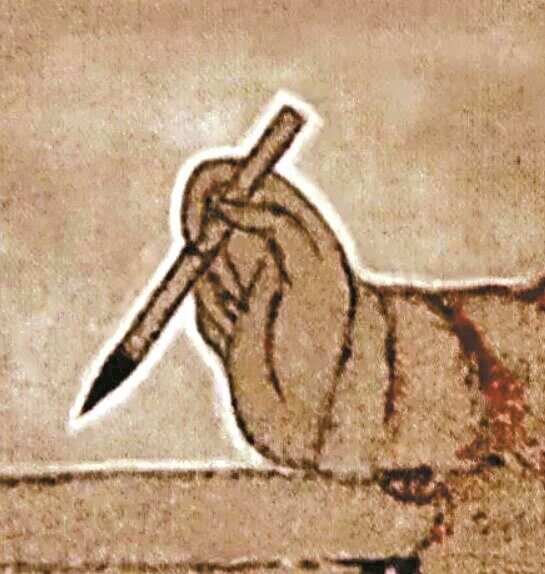 在唐代以前,人们写字大多双腿跽坐于席上,一手拿着竹简或者纸卷,一手拿毛笔。那样的姿势,用三个手指执笔很方便——那样的执笔方法和现代人拿钢笔很接近。“笔在空中,可作六面行动。即前后左右以及提按也”。所以当时书家写的字,笔画是灵动的。
