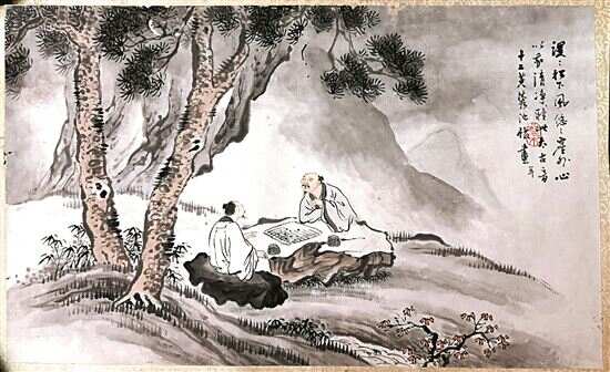 ■伍学藻的《松下棋图》的创作素材,取自赵孟頫《题洞阳徐真人万壑松风图》。