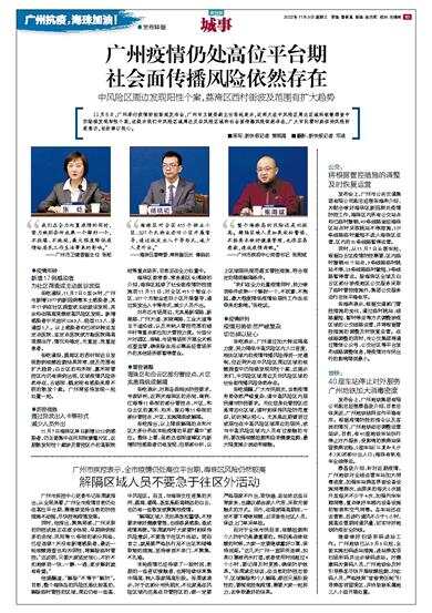 广州市疾控中心党委书记张周斌指出,从全局来看,广州全市疫情目前仍处在高位平台期,需继续坚持当前的防控措施不动摇,尽快控制疫情发展。