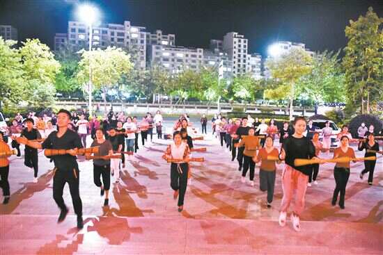 ■群众欢快地跳起连山特色的小长鼓广场舞。