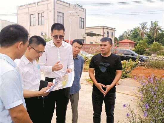 ■冯磊(中)与广州市规划和自然资源局南沙区分局相关负责人踏勘研究放坡村渔人休憩点设计方案。